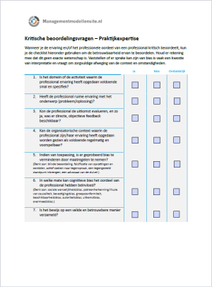 Wanneer je de ervaring en/of het professionele oordeel van een professional kritisch beoordeelt, kun je de checklist hieronder gebruiken om de betrouwbaarheid ervan te beoordelen. Houd er rekening mee dat dit geen exacte wetenschap is. Vaststellen of er sprake kan zijn van bias is vaak een kwestie van interpretatie en vraagt om zorgvuldige afweging van de context en omstandigheden.