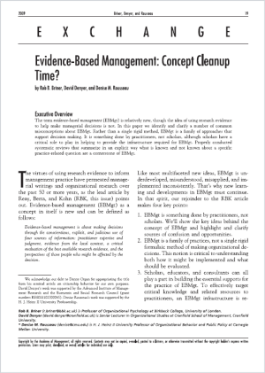 Dit artikel creëert duidelijkheid rond het begrip evidence-based management (EBMgt). De auteurs zien dat het woord overal wordt gebruikt, maar dat mensen er heel verschillende dingen mee bedoelen. Daardoor praten managers en onderzoekers vaak langs elkaar heen. Het doel van de auteurs is simpel: helder krijgen wat EBMgt wél is en wat niet, en wat je er in de praktijk mee moet doen.