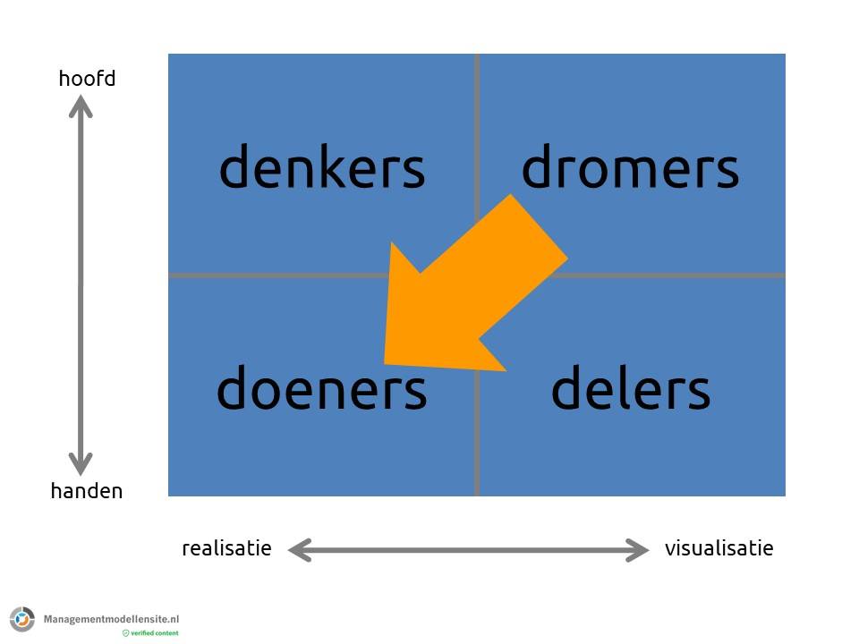 In de tabel zijn de competenties, eigenschappen en kwaliteiten verder uitgewerkt. Van de ‘dromer’ ga je naar de ‘doener’, en onderweg kom je de ‘denker’ en de ‘deler’ tegen. De ideale leider ondernemer heeft elementen van alle vier de onderdelen in zich. Een goede leider of ondernemer kent zijn type en krachten en is in staat zijn ‘tekortkomingen’ te compenseren of ontwikkelen.