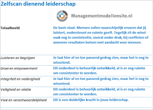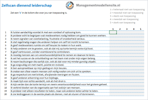 Door deze drie bronnen te combineren, is deze zelfscan gebaseerd op zowel individueel leiderschapsgedrag als op bredere relationele en organisatorische aspecten van dienend leiderschap. Daarmee is gekozen voor een inhoudelijke basis die zowel praktisch als onderzoeksmatig goed verdedigbaar is.